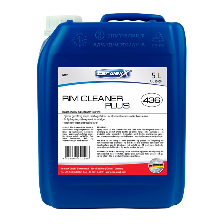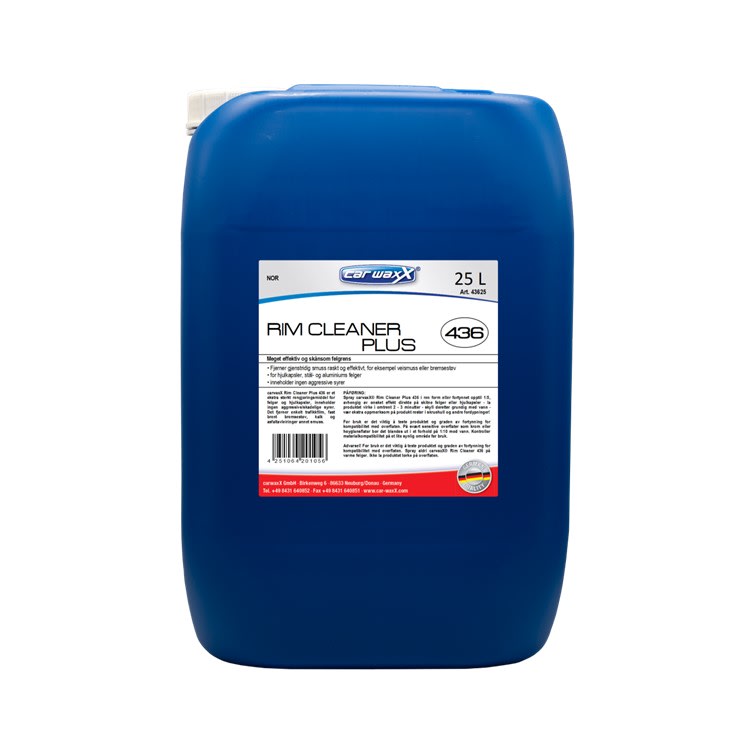 carwaxX Rim Cleaner Plus 436 er et ekstra sterkt rengjøringsmiddel for felger og hjulkapsler, inneholder ingen aggressive/skadelige syrer. Det fjerner enkelt trafikkfilm, fast brent bremsestøv, kalk og asfaltavleiringer annet smuss.