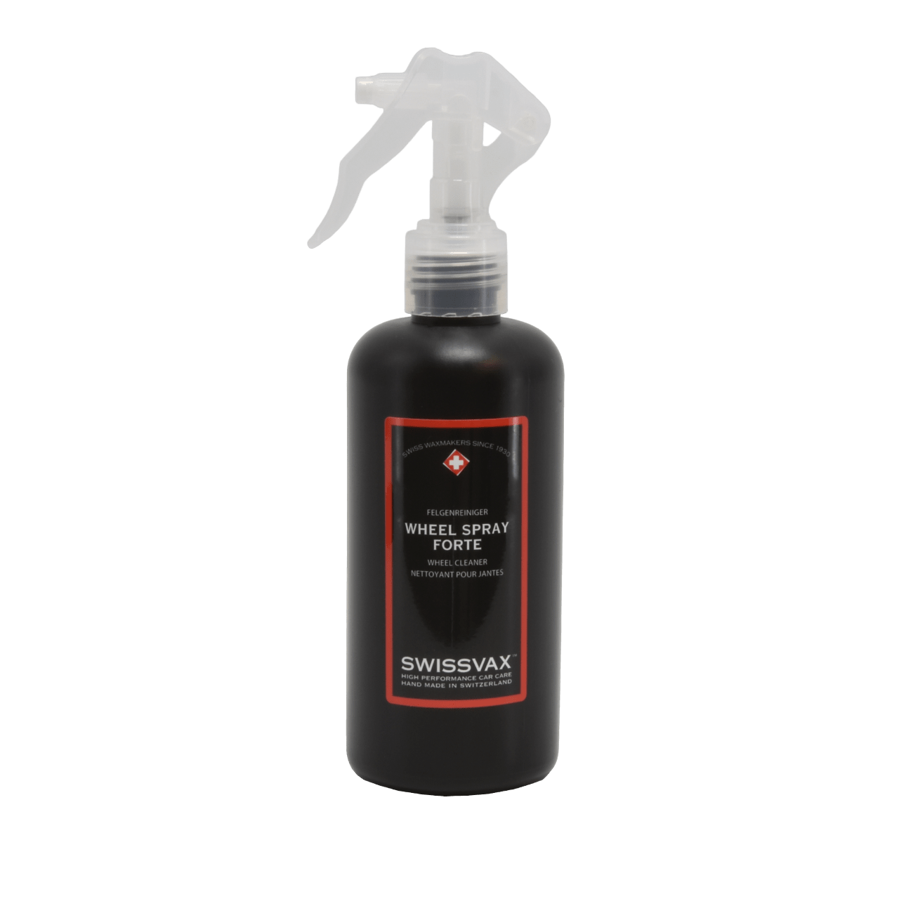 Swissvax Wheel Forte Spray er en moderne felgrens gel utviklet for enkel og effektiv rens av felgene. Den er i en geleform som setter seg godt på felgens overflate uten å renne av og er derfor meget effektiv til å løse opp skitt. Under den aktive rensefasen skifter geleen farge til rødfiolett (fargeindikator) som signaliserer hvor langt renseprosessen har kommet (jo mørkere, jo lengre). Rensen gjøres automatisk – spray på, la den virke og spyl av med høytrykksvasker eller med en kraftig hageslange.