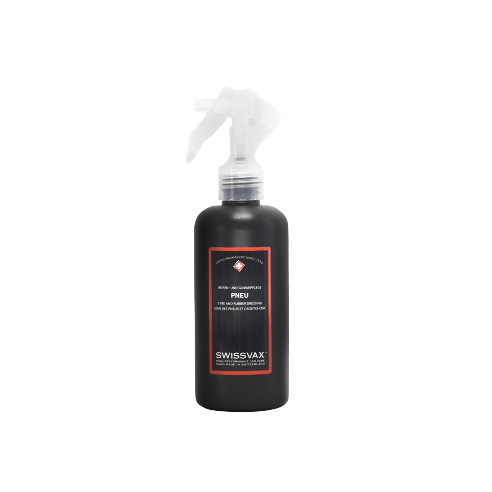 Jevne, sort dekksider er som kremen på kaken når det gjelder et perfekt utseende på enhver bil. Swissvax Pneu er en emulsjon som består av glansfremhevede og bevarende midler som erstatter fuktighet som gummiblandingen har mistet – og som beskytter overflaten mot misfarging og sprekkdannelser. Den er veldig enkel å påføre og er garantert harmløs på dekk, felger og bilens lakk. Den ideelle pleie for alle typer dekk, inkludert dekk med hvite sider (Pneu White).